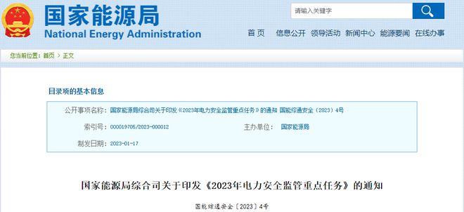 1月30日,國家能源局發(fā)布通知,印發(fā)《2023年電力安全監(jiān)管重點任務(wù)》(簡稱《任務(wù)》)。
