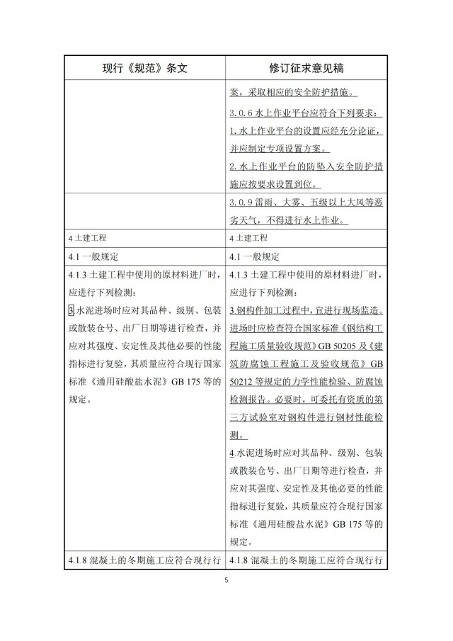 根據(jù)局部修訂條文對照表,新增水上光伏測繪、施工以及安全等一系列要求。例如,水上光伏發(fā)電站水下測繪工作應完成,水下障礙物應全部清理完畢。如施工場地有航道交叉,應采取相應安全保障措施。對于水面作業(yè)、作業(yè)面高度在2m及以上、作業(yè)面坡度大于30゜等特殊作業(yè)環(huán)境的項目,應編制專項施工方案,采取相應的安全防護措施。水上作業(yè)平臺應符合下列要求:1.水上作業(yè)平臺的設置應經充分論證,并應制定專項設置方案。2.水上作業(yè)平臺的防墜入安全防護措施應按要求設置到位。