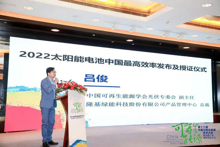 中國可再生能源學(xué)會光伏專委會副主任、隆基綠能產(chǎn)品管理中心總裁呂俊博士進(jìn)行《2022太陽電池中國最高效率》發(fā)布。