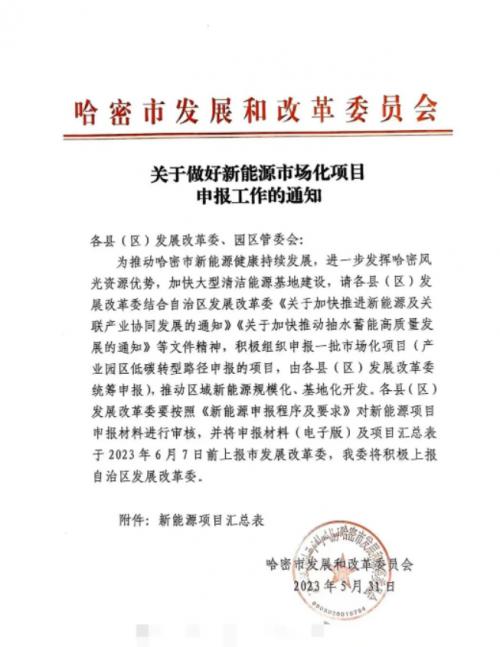 《通知》指出,為推動(dòng)哈密市新能源健康持續(xù)發(fā)展,進(jìn)一步發(fā)揮哈密風(fēng)光資源優(yōu)勢,加快大型清潔能源基地建設(shè),請(qǐng)各縣(區(qū))發(fā)展改革委結(jié)合自治區(qū)發(fā)展改革委《關(guān)于加快推進(jìn)新能源及關(guān)聯(lián)產(chǎn)業(yè)協(xié)同發(fā)展的通知》《關(guān)于加快推動(dòng)抽水蓄能高質(zhì)量發(fā)展的通知》等文件精神,積極組織申報(bào)一批市場化項(xiàng)目(產(chǎn)業(yè)園區(qū)低碳轉(zhuǎn)型路徑申報(bào)的項(xiàng)目,由各縣(區(qū))發(fā)展改革委統(tǒng)籌申報(bào)),推動(dòng)區(qū)域新能源規(guī)模化、基地化開發(fā)。