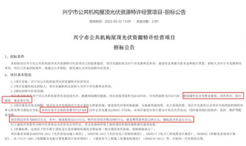 以興寧市招標(biāo)公告為例,招標(biāo)公告顯示,興寧市公共機(jī)構(gòu)屋頂光伏資源特許經(jīng)營范圍為利用公共機(jī)構(gòu)屋頂布設(shè)屋頂光伏,規(guī)模為75.274MW,項(xiàng)目的總投資為66833萬元,其中:建設(shè)投資32513萬元,特許經(jīng)營權(quán)價(jià)格32000萬元,建設(shè)期貸款利息2299萬元,鋪底流動(dòng)資金21萬元。按照這一數(shù)據(jù)折算,興寧市整縣光伏單瓦投資成本為8.88元/瓦,對應(yīng)的特許權(quán)經(jīng)營費(fèi)為4.25元/瓦。