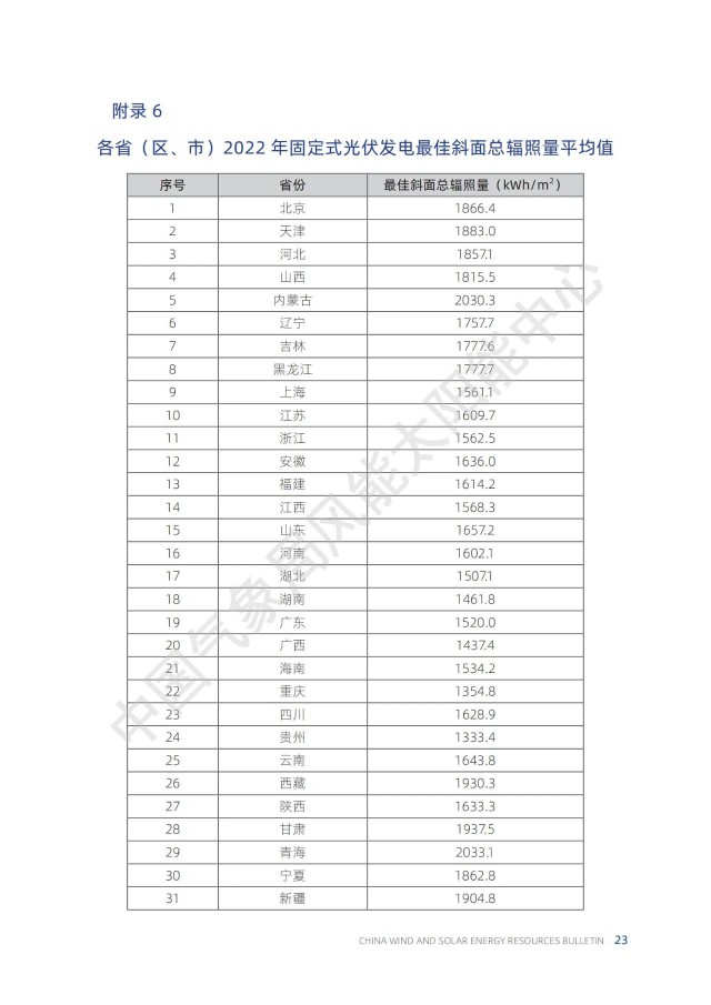 上圖為全國平均值,具體到各個省份的年水平面總輻射量、年傾斜面面總輻射量數值如下表所示。
