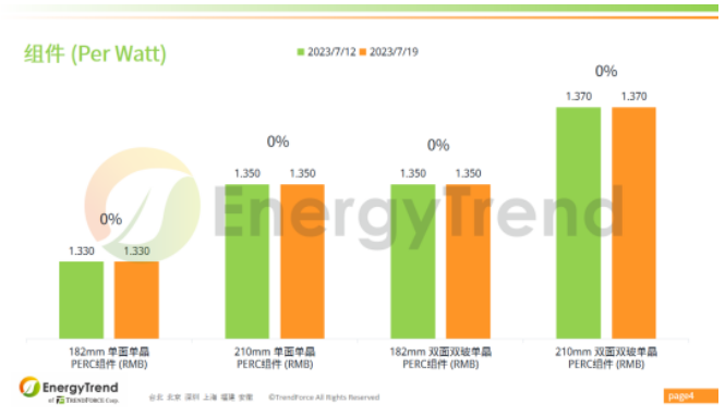 182mm 單面單晶PERC組件價(jià)格為 RMB1.33/W;210mm 單面單晶PERC組件報(bào)價(jià)為 RMB1.35/W;182mm 雙面雙玻單晶PERC組件最新報(bào)價(jià)為 RMB1.35/W;210mm 雙面雙玻單晶PERC組件報(bào)價(jià)為 RMB1.37/W。