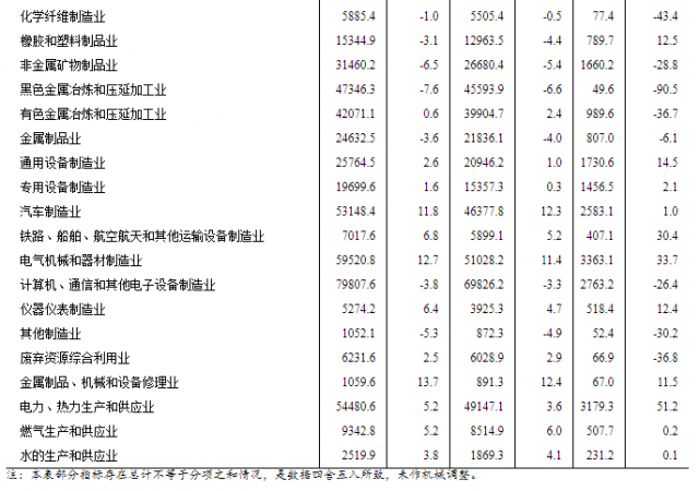 1—7月份,在41個工業(yè)大類行業(yè)中,13個行業(yè)利潤總額同比增長,28個行業(yè)下降。主要行業(yè)利潤情況如下:電力、熱力生產(chǎn)和供應(yīng)業(yè)利潤總額同比增長51.2%,電氣機械和器材制造業(yè)增長33.7%,通用設(shè)備制造業(yè)增長14.5%,專用設(shè)備制造業(yè)增長2.1%,汽車制造業(yè)增長1.0%,石油和天然氣開采業(yè)下降11.4%,紡織業(yè)下降20.3%,煤炭開采和洗選業(yè)下降26.2%,計算機、通信和其他電子設(shè)備制造業(yè)下降26.4%,非金屬礦物制品業(yè)下降28.8%,農(nóng)副食品加工業(yè)下降32.6%,有色金屬冶煉和壓延加工業(yè)下降36.7%,化學(xué)原料和化學(xué)制品制造業(yè)下降54.3%,石油、煤炭及其他燃料加工業(yè)下降87.0%,黑色金屬冶煉和壓延加工業(yè)下降90.5%。