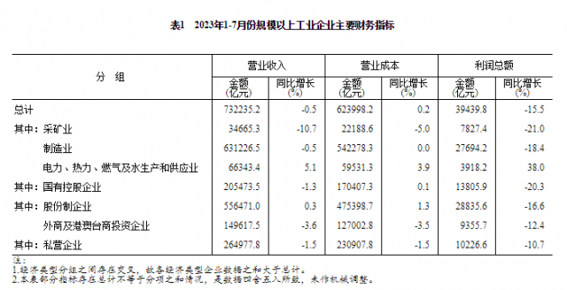 1—7月份,規(guī)模以上工業(yè)企業(yè)中,國有控股企業(yè)實現(xiàn)利潤總額13805.9億元,同比下降20.3%;股份制企業(yè)實現(xiàn)利潤總額28835.6億元,下降16.6%;外商及港澳臺商投資企業(yè)實現(xiàn)利潤總額9355.7億元,下降12.4%;私營企業(yè)實現(xiàn)利潤總額10226.6億元,下降10.7%。