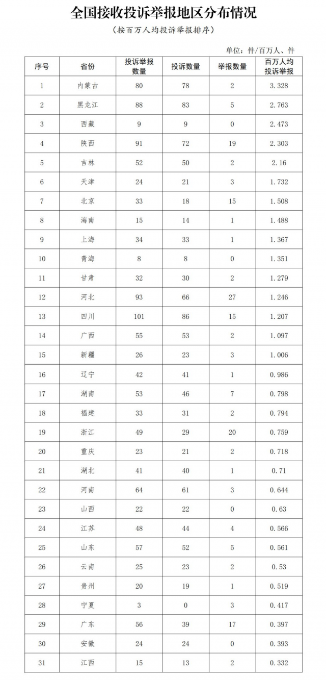 各省(自治區(qū)、直轄市)按照接收投訴舉報(bào)數(shù)量排序,四川、河北、陜西、黑龍江、內(nèi)蒙古排在全國(guó)前5位。其中:按投訴數(shù)量排序,四川、黑龍江、內(nèi)蒙古、陜西、河北排在全國(guó)前5位;按舉報(bào)數(shù)量排序,河北、浙江、陜西、廣東、北京(四川并列)排在全國(guó)前5位;按百萬人均投訴舉報(bào)數(shù)量排序,內(nèi)蒙古、黑龍江、西藏、陜西、吉林排在全國(guó)前5位。(全國(guó)接收投訴舉報(bào)地區(qū)分布情況詳見附件1)
