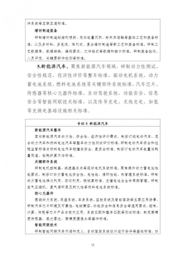 《方案》明確,在新能源汽車方面,聚焦新能源汽車領域,研制動力性測試、安全性規(guī)范、經(jīng)濟性評價等整車標準,驅(qū)動電機系統(tǒng)、動力蓄電池系統(tǒng)、燃料電池系統(tǒng)等關(guān)鍵部件系統(tǒng)標準,汽車芯片、傳感器等核心元器件標準,自動駕駛系統(tǒng)、功能安全、信息安全等智能網(wǎng)聯(lián)技術(shù)標準,以及傳導充電、無線充電、加氫等充換電基礎設施相關(guān)標準。