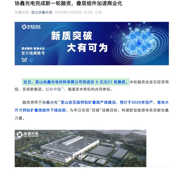 就在12月初,協(xié)鑫集團旗下鈣鈦礦業(yè)務核心企業(yè)——昆山協(xié)鑫光電材料有限公司(下稱“協(xié)鑫光電”)宣布,公司已經(jīng)完成近5億元C1輪融資。該輪融資由金石投資領投,昆高新集團、紅杉中國、瀚漾資本等機構共同參投。光源資本擔任本輪融資獨家財務顧問。