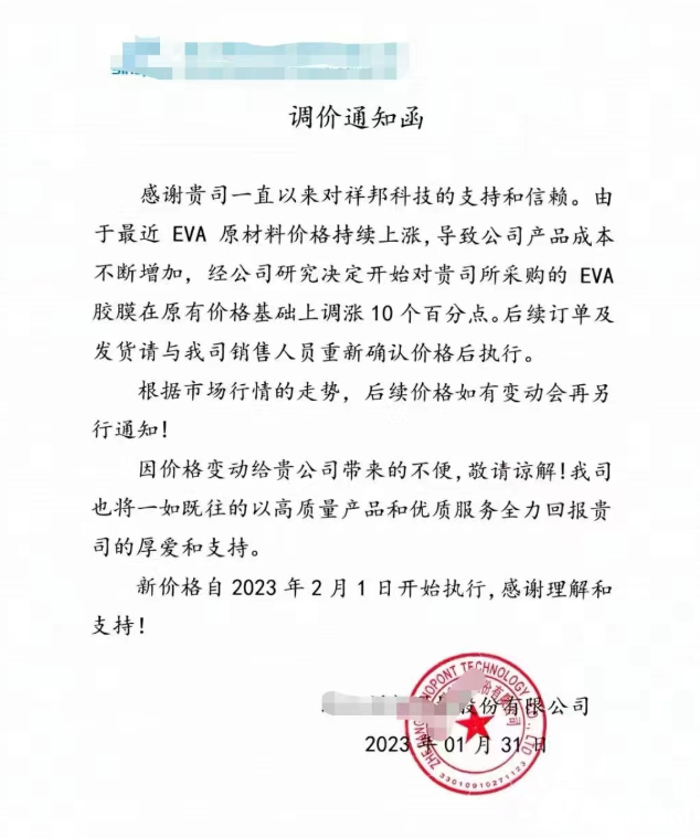 感謝貴司一直以來(lái)對(duì)祥邦科技的支持和信賴。由于最近 EVA 原材料價(jià)格持續(xù)上漲,導(dǎo)致公司產(chǎn)品成本不斷增加,經(jīng)公司研究決定開始對(duì)貴司所采購(gòu)的 EVA膠膜在原有價(jià)格基礎(chǔ)上調(diào)漲 10 個(gè)百分點(diǎn)。后續(xù)訂單及發(fā)貨請(qǐng)與我司銷售人員重新確認(rèn)價(jià)格后執(zhí)行。