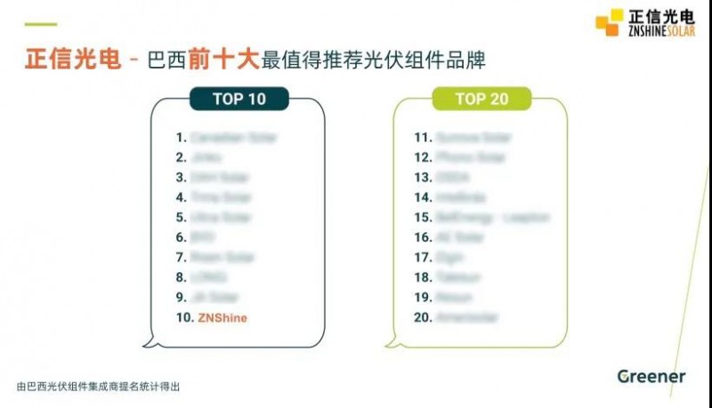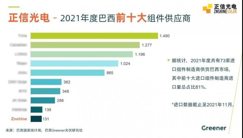 根據(jù)巴西國家統(tǒng)計局及巴西權(quán)威光伏研究社Greener的最新統(tǒng)計,正信光電以堅挺的組件出口業(yè)績,再次名列2021年度巴西前十大組件供應商。