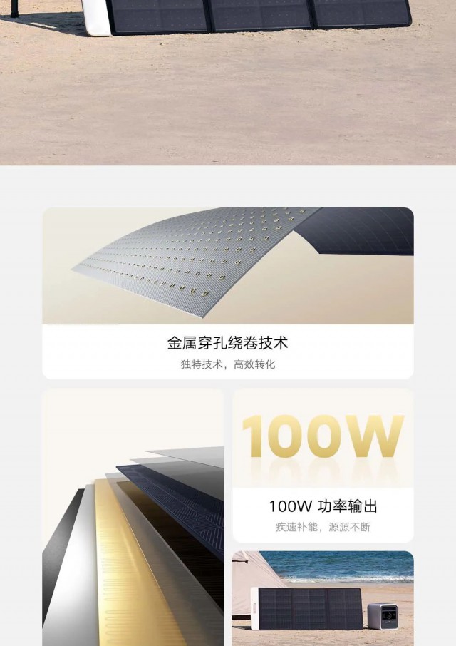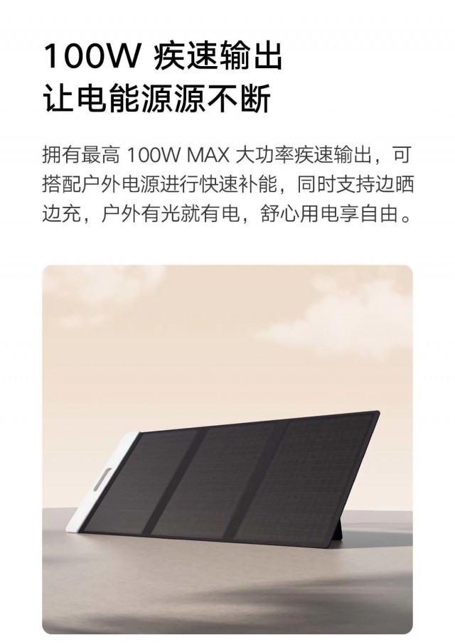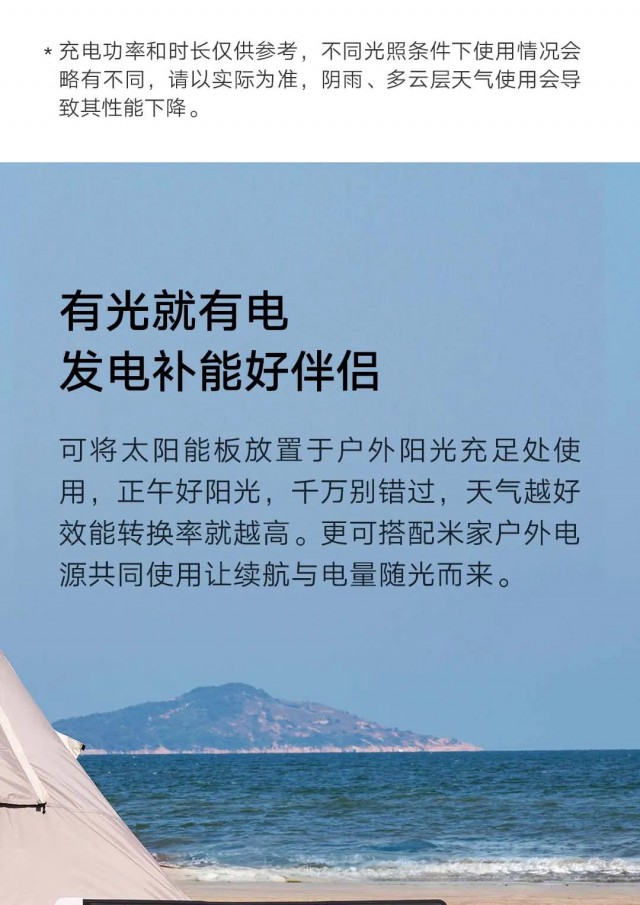 米家太陽能板100W擁有最高100W MAX大功率,可搭配戶外電源進(jìn)行快速補能,同時支持邊曬邊充,戶外有光就有電。