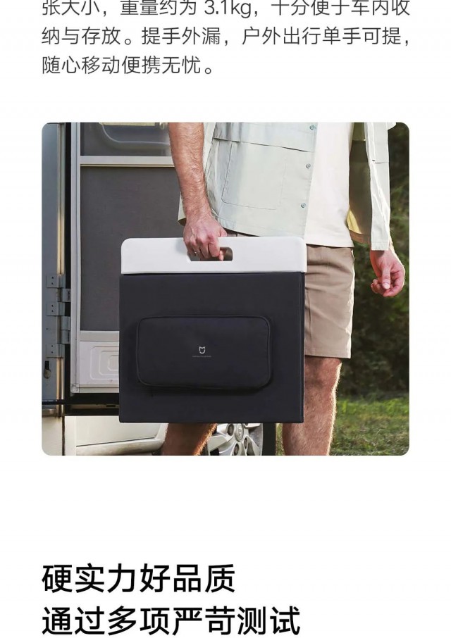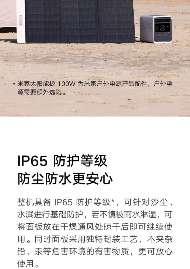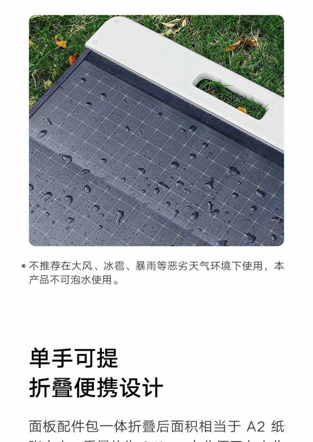此外,米家太陽能板100W整機(jī)具備IP65防護(hù)等級,可針對沙塵、水濺等進(jìn)行基礎(chǔ)防護(hù)。面板配件包一體折疊后面積相當(dāng)于A2紙張大小,重量約為3.1kg,十分便于車內(nèi)收納與存放。提手外漏設(shè)計,戶外出行單手可提,隨心移動便攜無憂。