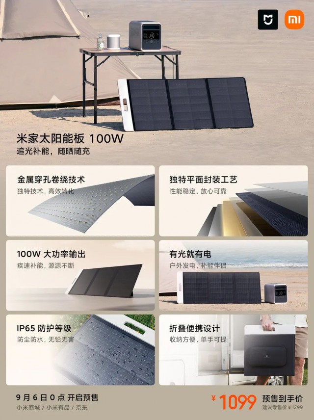 9月6日,小米智能生態(tài)微博官方宣布,米家太陽能板100W開啟定金預(yù)售,建議零售價1299元,預(yù)售到手價1099元。