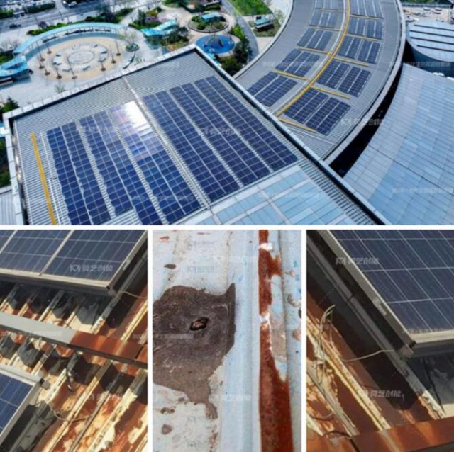 若只依靠彩鋼瓦本身的屋面,很容易因?yàn)橥繉雍穸炔粔?,加之紫外線、雨水、光合作用等自然因素的侵蝕,造成屋面彩鋼瓦接縫處開裂、鉚釘松動(dòng)生銹、屋面銹蝕擴(kuò)大、瓦脊銹蝕銹穿導(dǎo)致屋面出現(xiàn)滲水漏水的情況。同時(shí)因其坡度小,可能會(huì)造成雨水排泄不暢、積水超過彩鋼瓦接縫高度或鉚釘孔高度及溝沿瓦而導(dǎo)致銹損滲漏。而工廠生產(chǎn)過程中排放的酸性、堿性等氣體長(zhǎng)期與屋面接觸,也會(huì)腐蝕鋼結(jié)構(gòu),加速銹蝕、穿孔導(dǎo)致滲漏。