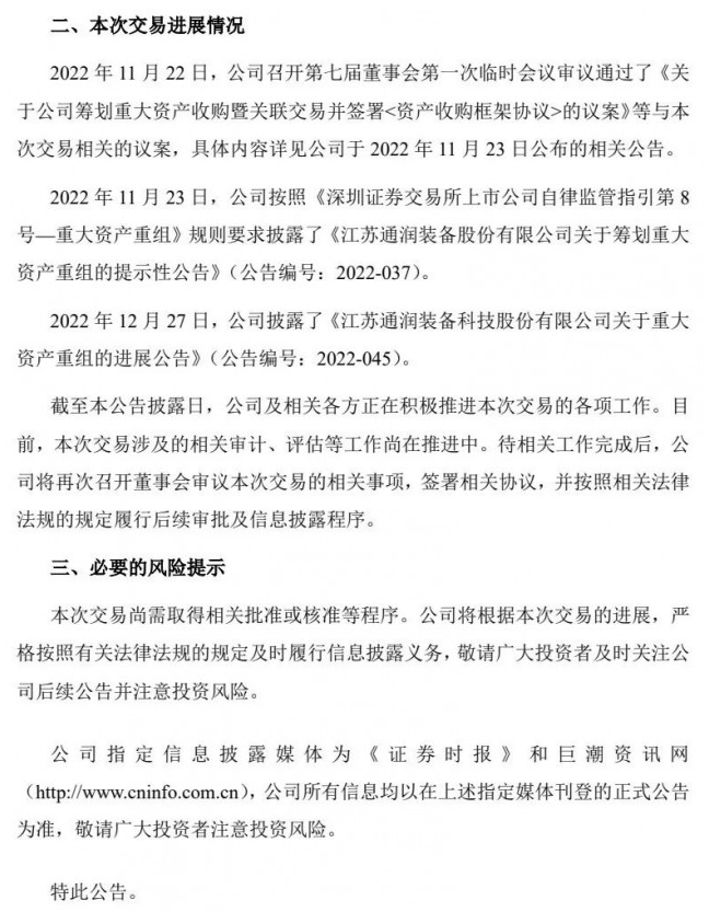 2022年12月27日,公司披露了《江蘇通潤裝備科技股份有限公司關于重大資產(chǎn)重組的進展公告》。截至本公告披露日,公司及相關各方正在積極推進本次交易的各項工作。目前,本次交易涉及的相關審計、評估等工作尚在推進中。待相關工作完成后,公司將再次召開董事會審議本次交易的相關事項,簽署相關協(xié)議,并按照相關法律法規(guī)的規(guī)定履行后續(xù)審批及信息披露程序。