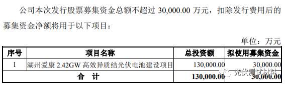 4月24日,愛康科技發(fā)布公告稱,公司擬向特定對象發(fā)行股票募資不超過3億元,扣除相關發(fā)行費用后用于湖州愛康2.42GW高效異質結光伏電池建設項目。