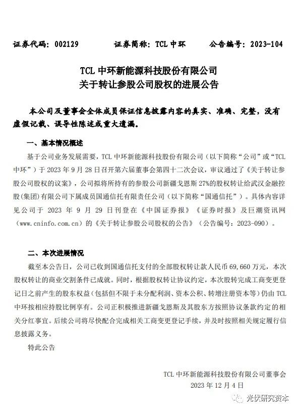 12月4日消息, TCL中環(huán)發(fā)布公告稱,公司已成功轉(zhuǎn)讓其所持有的新疆戈恩斯27%的股權(quán)給武漢金融控股(集團)有限公司下屬的國通信托有限責任公司,并已收到全部股權(quán)轉(zhuǎn)讓款人民幣6.97億元。根據(jù)股權(quán)轉(zhuǎn)讓協(xié)議,TCL中環(huán)在完成工商變更登記日之前仍享有相應股東權(quán)益。公司目前正在積極推進分紅事宜,并將盡快完成相關(guān)工商變更登記手續(xù)。