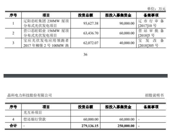 晶科科技發(fā)行募集資金總額為25.98億元,募集資金凈額為24.17億元。晶科科技最終募集資金凈額比原計劃少8324.30萬元。2020年4月25日,晶科科技披露的招股說明書顯示,公司擬募集資金25.00億元,分別用于遼陽忠旺集團230MW屋頂分布式光伏發(fā)電項目、營口忠旺鋁業(yè)156MW屋頂分布式光伏發(fā)電項目、寶應(yīng)光伏發(fā)電應(yīng)用領(lǐng)跑者2017年柳堡2號100MW漁光互補項目、償還銀行貸款。