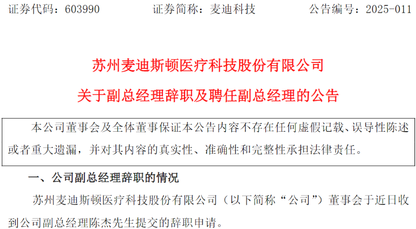 1月27日下午,麥迪科技(603990)發(fā)布公告稱,該公司董事會(huì)于近日收到公司副總經(jīng)理陳杰提交的辭職申請(qǐng)。