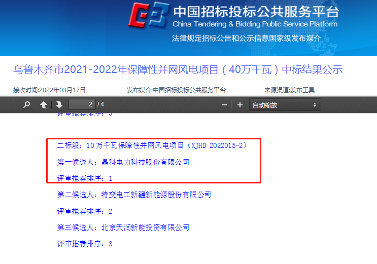 近日,烏魯木齊市2021-2022年保障性并網(wǎng)風(fēng)電項(xiàng)目(40萬千瓦)中標(biāo)結(jié)果公示,晶科科技(601778.SH)憑借領(lǐng)先的技術(shù)及良好的行業(yè)口碑,中標(biāo)了其中10萬千瓦(100MW)規(guī)模的保障性并網(wǎng)風(fēng)電項(xiàng)目。此次中標(biāo),是晶科科技成立以來首次獲得風(fēng)電項(xiàng)目,也是公司推動可再生、清潔能源開發(fā)利用之路上新的里程碑,標(biāo)志著公司正式進(jìn)軍風(fēng)電市場。