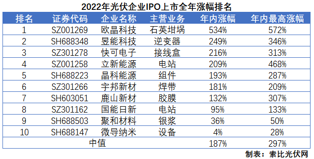 企業(yè)超募、股價(jià)暴漲、股民暴賺,這就是2022年成功登陸A股市場的10家光伏企業(yè)交出的“答卷”。而2023年,阿特斯、潤陽股份、美科股份、新特能源等一眾龍頭和新貴,也即將登陸A股市場。