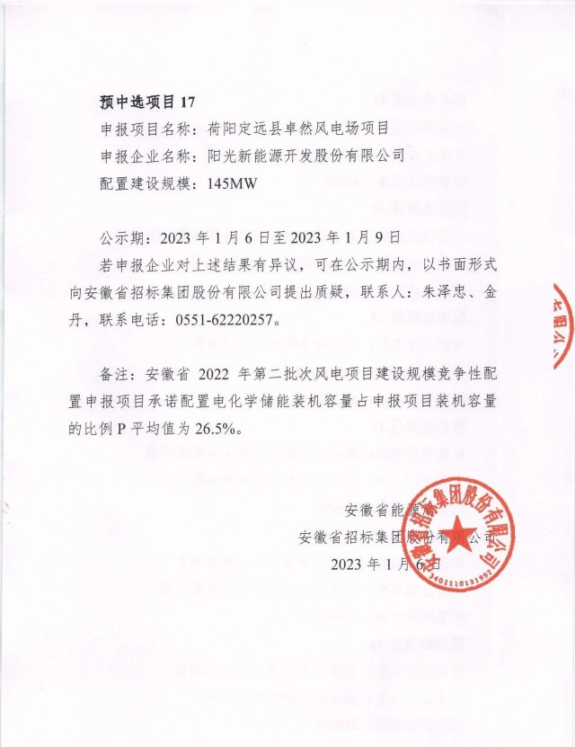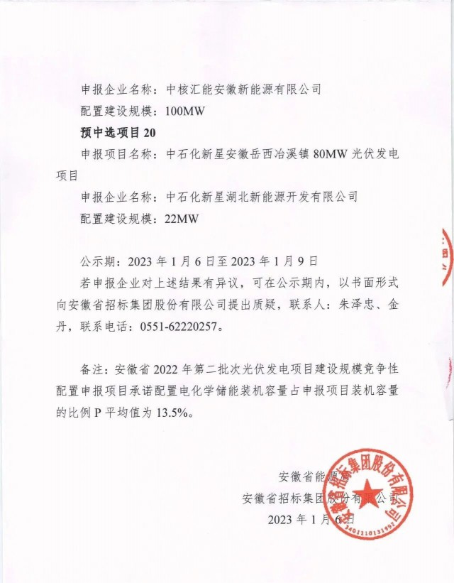 1月6日,安徽省能源局公示了2022年第二批光伏、風(fēng)電項(xiàng)目競爭性配置優(yōu)選結(jié)果,共計37個項(xiàng)目入選,其中光伏規(guī)模為1.5GW,項(xiàng)目20個;風(fēng)電項(xiàng)目規(guī)模為1.5GW,項(xiàng)目17個。