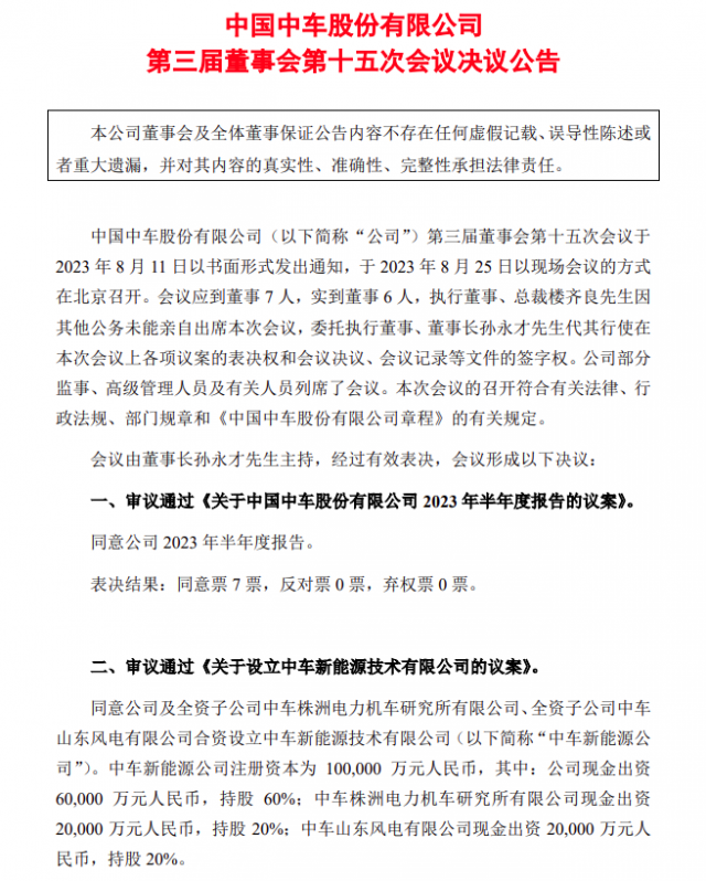 8月25日,中國中車發(fā)布第三屆董事會第十五次會議決議公告。其中董事會審議通過了《關于設立中車新能源技術有限公司的議案》,同意公司及全資子公司中車株洲電力機車研究所有限公司、全資子公司中車山東風電有限公司合資設立中車新能源技術有限公司(以下簡稱“中車新能源公司”)。