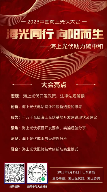 2023年9月15日,索比光伏網(wǎng)以“海光同行,向陽而生——海上光伏助力碳中和”為主題,計劃在山東青島舉辦“2023中國海上光伏大會”,為協(xié)力打造技術(shù)先進、生態(tài)友好、智慧融合的“環(huán)渤海、沿黃?!彪p千萬千瓦級海上光伏基地貢獻力量。