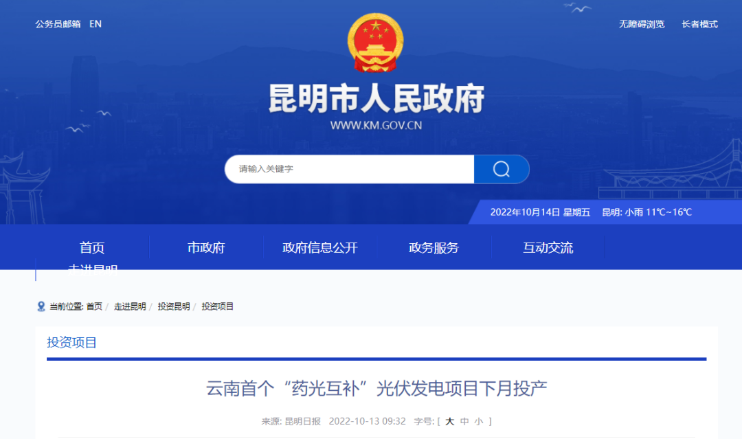 10月13日,昆明市發(fā)布首個“藥光互補”光伏發(fā)電項目下月投產(chǎn)。
