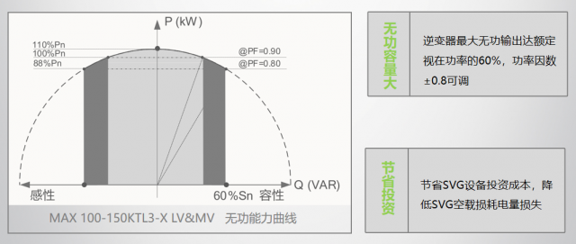 但隨著光伏電站的投運(yùn),原來的無功補(bǔ)償裝置的補(bǔ)償容量不夠用,需要額外購(gòu)買無功補(bǔ)償裝置,這時(shí)逆變器可通過監(jiān)測(cè)并網(wǎng)點(diǎn)負(fù)載端的功率因數(shù),在發(fā)有功電量的同時(shí),智能調(diào)整功率因數(shù)同時(shí)發(fā)一部分無功電量進(jìn)行智能無功補(bǔ)償,這樣可以幫用戶節(jié)省無功補(bǔ)償裝置的費(fèi)用,也可以減少無功補(bǔ)償裝置空載損耗的電量。