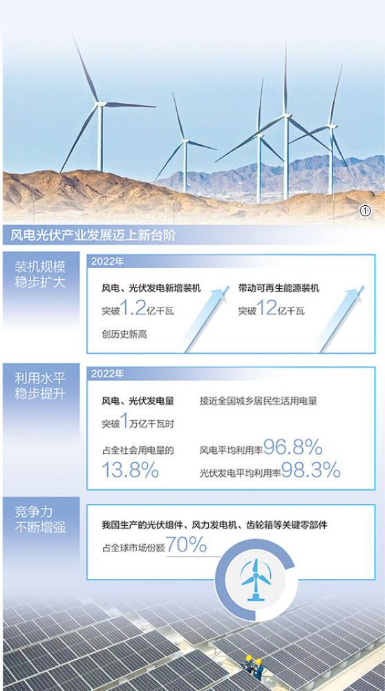 出口總額超過(guò)512億美元,同比增長(zhǎng)80.3%——2022年,我國(guó)光伏產(chǎn)業(yè)在國(guó)際市場(chǎng)的表現(xiàn)亮眼。歷經(jīng)多年深耕細(xì)作,我國(guó)風(fēng)電光伏產(chǎn)業(yè)競(jìng)爭(zhēng)力大幅提升,光伏組件、風(fēng)力發(fā)電機(jī)、齒輪箱等關(guān)鍵零部件占全球市場(chǎng)份額的比重提升至70%。在國(guó)內(nèi),風(fēng)電光伏也已成為新增發(fā)電裝機(jī)和新增發(fā)電量的主體,2022年占比分別達(dá)到78%和55%以上,累計(jì)裝機(jī)突破7億千瓦,相當(dāng)于30多個(gè)三峽電站。