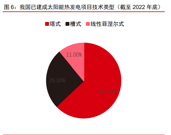 我國已建成光熱項目中,塔式光熱占比相對較高。根據(jù) CSTA 數(shù)據(jù),截至 2021 年底, 全球太陽能熱發(fā)電累計裝機容量達到 6.8GW,槽式、塔式、線性菲涅耳技術(shù)裝機在全球主 要國家和地區(qū)的占比為 76%、20%和 4%。截至 2022 年底,我國太陽能熱發(fā)電累計裝機 容量為 588MW(含 MW 級以上規(guī)模的發(fā)電系統(tǒng)),塔式光熱電站雖然前期系統(tǒng)建設(shè)一次性投資較大且維護成本較高,但更適合我國西部地區(qū)晝夜溫差大、缺少水資源、自然環(huán)境 惡劣等特點,同時因槽式系統(tǒng)和線菲式系統(tǒng)集熱效率偏低、對工質(zhì)加熱能力較弱等因素, 因而在我國塔式光熱電站應(yīng)用范圍相對較廣。