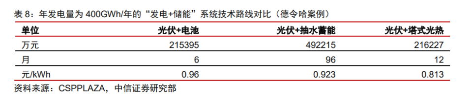 熔鹽儲能使用壽命可達 25-30 年,運行穩(wěn)定性好、無爆炸、火災(zāi)等危險,具備安全友 好等特性。根據(jù)中控太陽能測算,光熱儲能調(diào)峰電站為光伏配置 20%熔鹽儲能服務(wù)可以有 效解決光伏棄光問題,同時在相同的儲能調(diào)峰補貼下,光伏+光熱儲能調(diào)峰電站的綜合上 網(wǎng)電價低于光伏+鋰電池儲能。 除光熱電站配套外,熔鹽儲能還可用于清潔供熱、提供工業(yè)蒸汽、火電靈活性改造等 方面。熔鹽儲能系統(tǒng)可以使用太陽能、谷電、工業(yè)余熱等方式加熱熔鹽工質(zhì)進行儲存,在需求時段通過熔鹽放熱轉(zhuǎn)換為熱能實現(xiàn)工業(yè)蒸汽制備、建筑供熱等用途。以熔鹽儲熱供暖 系統(tǒng)為例,在夜間谷電時段可以通過谷電加熱熔鹽進入高溫熔鹽罐,在用熱時段通過熔鹽 泵抽出高溫熔鹽與市政用水在換熱器中進行熱交換為住宅小區(qū)提供熱水。熔鹽儲熱供暖系 統(tǒng)改造時只需要將燃煤鍋爐替換為熔鹽儲熱-加熱-換熱系統(tǒng),供水管道和末端設(shè)備可繼續(xù) 使用無需改造,改造建設(shè)成本較低;與電采暖相比,充分利用谷電加熱使運行費用大幅下 降,提高了供暖系統(tǒng)的經(jīng)濟性。