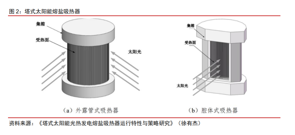 在光熱電站中,吸熱裝置主要作為中間環(huán)節(jié)收集聚光系統(tǒng)產(chǎn)生的熱能,并利用導(dǎo)熱工 質(zhì)將熱能轉(zhuǎn)送至蓄熱系統(tǒng)。