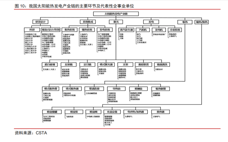 光熱發(fā)電產(chǎn)業(yè)鏈體系可分為研發(fā)、設(shè)計、制造、安裝等環(huán)節(jié),產(chǎn)業(yè)鏈國產(chǎn)化程度較高。 根據(jù) CSTA 數(shù)據(jù)顯示,在國家第一批光熱發(fā)電示范項目中,設(shè)備、材料國產(chǎn)化率超過 90%, 技術(shù)及裝備的可靠性和先進性在電站投運后得到有效驗證;在青海中控德令哈 50MW 塔 式光熱發(fā)電項目中,設(shè)備和材料國產(chǎn)化率已達到 95%以上。