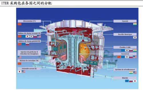 國際上,國際熱核聚變實驗堆ITER是全球在建的規(guī)模最大的可控磁約束核聚變裝置,由歐、中、俄、韓、日、美、印等7 方30 個國家聯(lián)合參與建設,其中中方實物+現(xiàn)金貢獻度達9%。