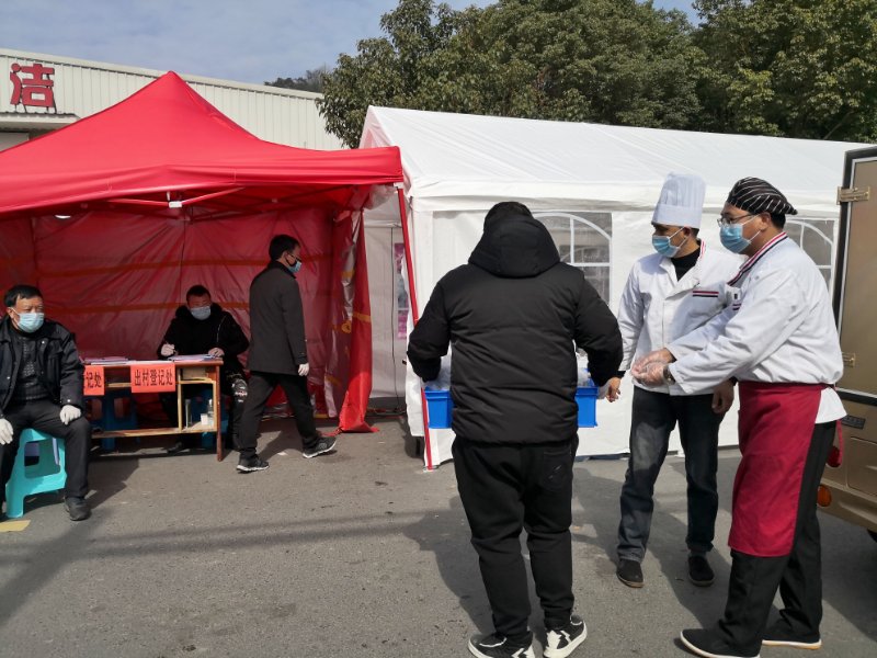 2月11日,中國能建浙江火電所屬的能華物業(yè)臺電服務(wù)中心,把送餐車開到了臺州電廠附近的前所街道關(guān)卡防控檢查點,將70份“愛心工作餐”,送到參與卡點檢查的志愿者手中,這已經(jīng)是能華物業(yè)第4天來送餐了。