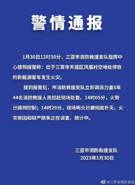 另?yè)?jù)三亞市消防支隊(duì)通報(bào)稱,30日12時(shí)38分,三亞市消防救援支隊(duì)指揮中心接到報(bào)警稱:位于三亞市天涯區(qū)鳳凰村空地處停放的新能源客車發(fā)生火災(zāi)。支隊(duì)調(diào)派8車44名消防救援人員趕赴現(xiàn)場(chǎng)處置。14時(shí)05分,火勢(shì)已得到控制;14時(shí)29分,現(xiàn)場(chǎng)明火已被徹底撲滅?;馂?zāi)原因和財(cái)產(chǎn)損失正在調(diào)查、統(tǒng)計(jì)中。