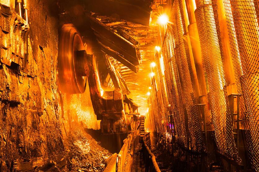 在井道中行駛20多分鐘,就到達(dá)了8.8米超大采高智能綜采工作面。只見直徑3.5米的兩只滾筒式采煤刀一前一后、一上一下,在接近3層樓高的煤壁上垂直飛旋,煤刀的刀頭異常鋒利,所到之處煤塊紛紛落下。一刀從機頭割到機尾,就是3000噸煤,這是常規(guī)工作面開采的兩倍。