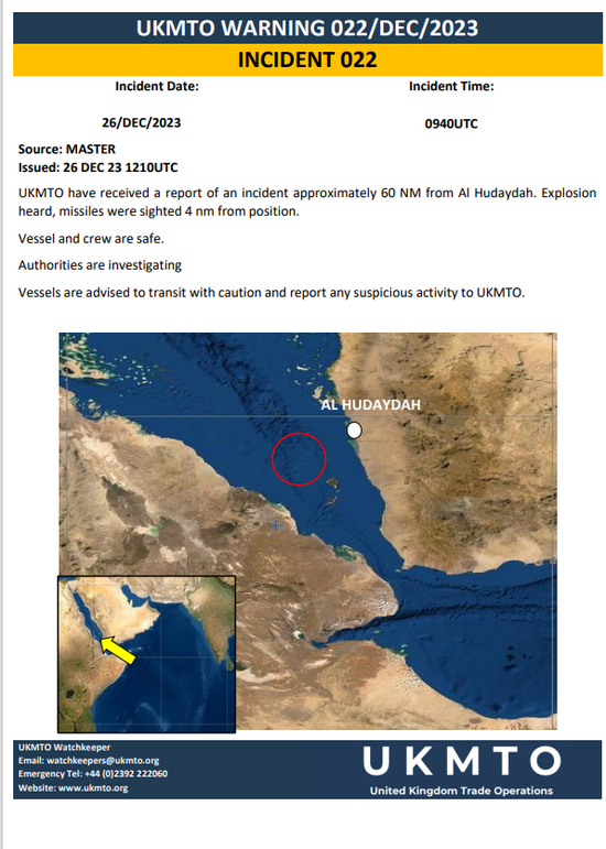 另外,據(jù)央視新聞消息,當(dāng)?shù)貢r(shí)間12月26日晚間,也門胡塞武裝發(fā)表聲明稱,在對(duì)紅海海域“MSC United”號(hào)商船三次發(fā)出警告遭拒后,胡塞武裝向其發(fā)射了導(dǎo)彈。