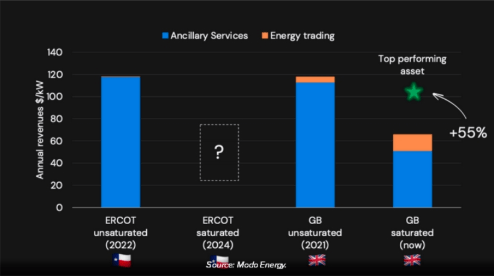 Modo Energy公司的Draper-Scrimshire將德克薩斯州電池儲能市場的發(fā)展與英國儲能市場進行了比較。并指出盡管電池儲能系統(tǒng)裝機容量不斷增長,獲得的收入與2021年相比有所下降,但表現(xiàn)最好的儲能系統(tǒng)可能會保持在原來的收入水平。