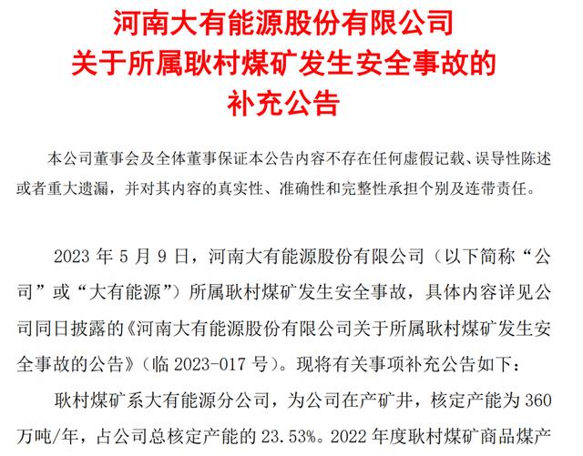 公告顯示,耿村煤礦系大有能源分公司,為公司在產(chǎn)礦井,核定產(chǎn)能為 360 萬噸/年,占公司總核定產(chǎn)能的 23.53%。2022 年度耿村煤礦商品煤產(chǎn) 量 287.45 萬噸,營業(yè)收入 13.22 億元,分別占公司同期商品煤產(chǎn)量 的 24.83%和營業(yè)收入的 15.39%。2023 年第一季度耿村煤礦商品煤產(chǎn) 量 51.51 萬噸,營業(yè)收入 2.15 億元,分別占公司同期商品煤產(chǎn)量的 18.32%和營業(yè)收入的 10.73%。目前,耿村煤礦正在組織實(shí)施停產(chǎn)救援,對公司造成的影響暫無法預(yù)測。公司將持續(xù)關(guān)注事故后續(xù)進(jìn)展并及時(shí)履行信息披露義務(wù),敬請廣大投資者注意投資風(fēng)險(xiǎn)。