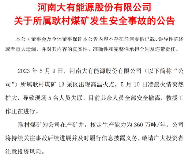 5月10日晚間大有能源公告,2023年5月9日,公司所屬耿村煤礦13采區(qū)出現(xiàn)高溫火點(diǎn),5月10日凌晨火情突然擴(kuò)大,導(dǎo)致現(xiàn)場5名人員失聯(lián)。目前其余人員全部安全撤離,救援工作正在進(jìn)行。