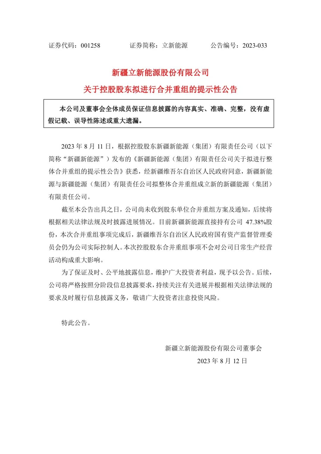 立新能源稱,截至公告出具之日,公司尚未收到股東單位合并重組方案及通知,后續(xù)將根據(jù)相關(guān)法律法規(guī)及時披露進展情況。根據(jù)新疆能源(集團)有限責(zé)任公司消息: