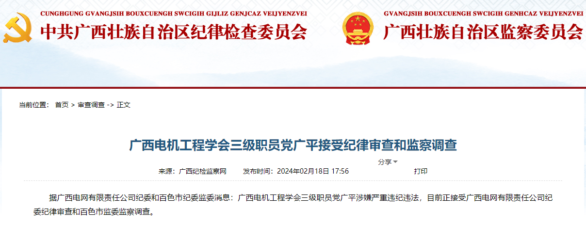 據(jù)廣西電網(wǎng)有限責任公司紀委和百色市紀委監(jiān)委消息:廣西電機工程學會三級職員黨廣平涉嫌嚴重違紀違法,目前正接受廣西電網(wǎng)有限責任公司紀委紀律審查和百色市監(jiān)委監(jiān)察調查。