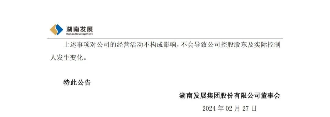 2月27日,湖南發(fā)展集團(tuán)股份有限公司發(fā)布關(guān)于控股股東變更名稱及注冊資本的公告,公告顯示:湖南發(fā)展集團(tuán)股份有限公司于近日收到公司控股股東通知,根據(jù)湖南省人民政府辦公廳《關(guān)于印發(fā)<湖南省能源投資集團(tuán)有限公司組建方案>的通知》(湘政辦函〔2024〕9號),公司控股股東名稱由“湖南湘投控股集團(tuán)有限公司”變更為“湖南省能源投資集團(tuán)有限公司”,注冊資本由150億元變更為300億元。除上述變更外,營業(yè)執(zhí)照其他登記信息不變。公司控股股東已在湖南省市場監(jiān)督管理局完成工商變更登記手續(xù)。