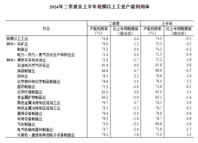 據(jù)國家統(tǒng)計局網(wǎng)站消息,2024年二季度,全國規(guī)模以上工業(yè)產(chǎn)能利用率為74.9%,比上年同期上升0.4個百分點,比一季度上升1.3個百分點。
