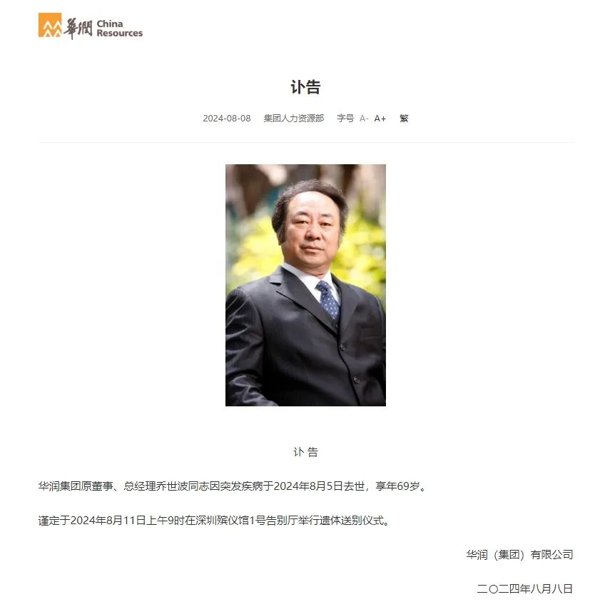 2024年8月5日,華潤集團(tuán)原董事、總經(jīng)理喬世波因突發(fā)疾病去世,享年69歲。其遺體送別儀式定于8月11日上午9時在深圳殯儀館1號告別廳舉行。