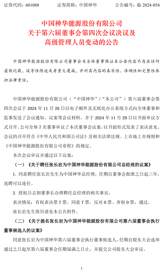 中國神華11月30日發(fā)布公告,公司第六屆董事會第四次會議于2024年11月26日以電子郵件及無紙化辦公系統(tǒng)方式向全體董事和監(jiān)事發(fā)送了會議通知、議案等會議材料,并于2024年11月29日以書面審議方式召開。公司全體7名董事審議了本次董事會議案,以書面形式發(fā)表了表決意見。