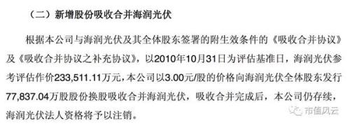 根據(jù)報(bào)告書,原海潤光伏2008年、2009年和2010年1~10月實(shí)現(xiàn)的凈利潤分別為2.11億、0.26億(據(jù)說是受金融危機(jī)影響)、2.7億,妥妥的優(yōu)質(zhì)資產(chǎn)。